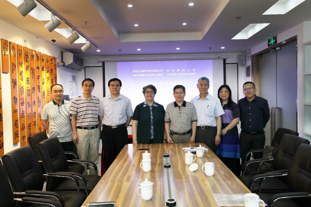 资深教授王宁先生、汉字实验室主任王立军教授代表汉字实验室,与李政放董事长签订了《战略合作框架协议》。教育部基础教育司课程处原处长沈白榆先生见证了签字仪式。 双方本着平等互利、优势互补的原则,天朗公司充分发挥其在关联技术、融合出版、产品运营、客户服务等方面的优势,汉字实验室充分发挥在汉语言文字、学术研究、教育教学、规划设计、资源开发等方面的优势,共同致力于汉字资源建设、汉字教学产品开发、文化推广等方面的深度合作,为结成长期全面的战略伙伴关系而共同努力。 签字仪式后,天朗公司一行参观了汉字实验室,并与王宁先生等进行了深入交流。 出席本次活动的还有天朗公司石磊副总经理、徐彦明副总经理和李博文主任,北师大汉字实验室副主任宋继华教授和实验室主管温英明老师等。