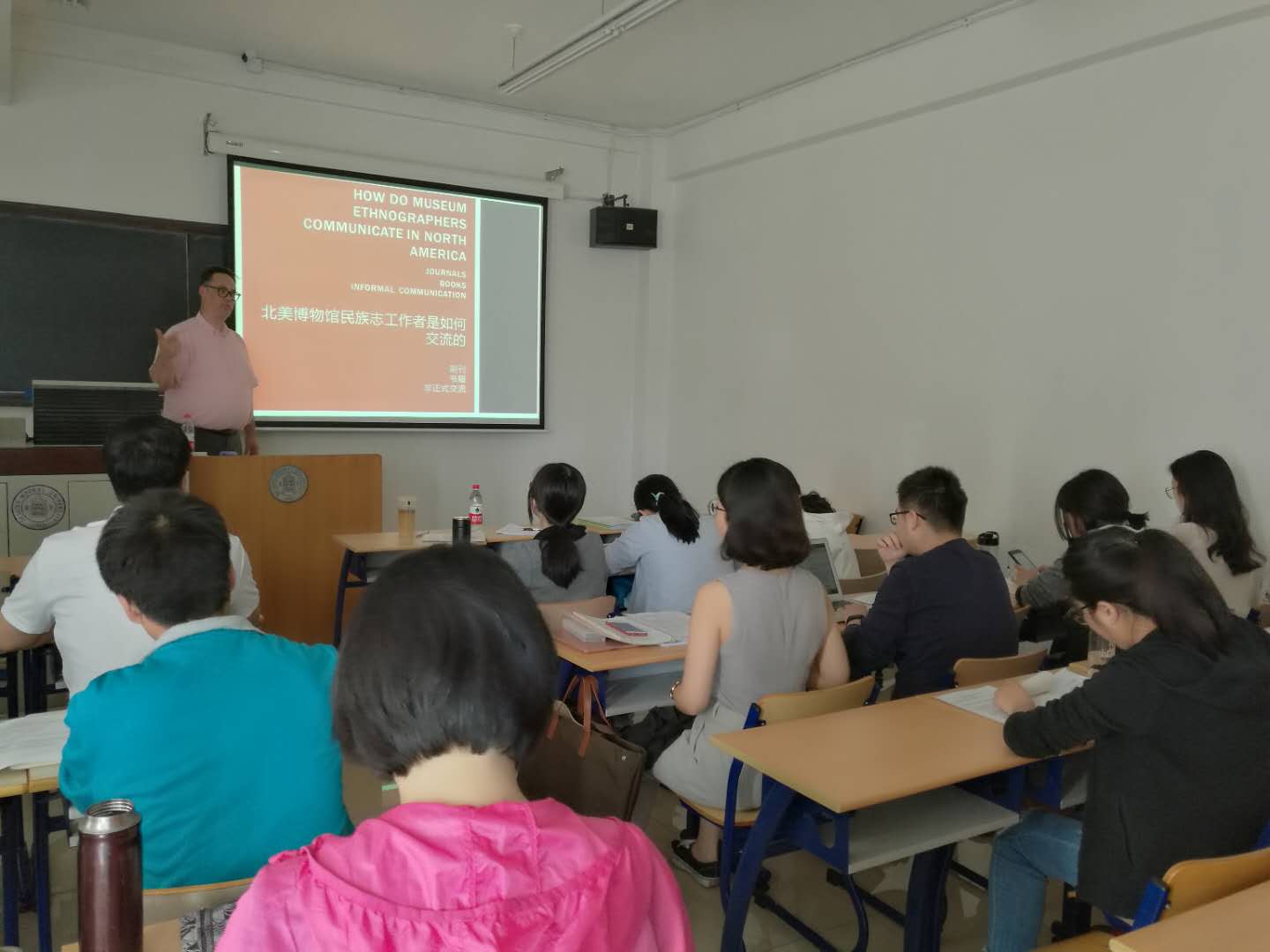 、南昌大学的相关学者以及本校数十位博士生、硕士生和本科生聆听了讲座。 Jason Baird Jackson是民俗学和人类学教授,同时也是印第安纳大学马瑟斯世界文化博物馆(Marthers Museum of World Cultures)的馆长。他的主要研究领域是北美原住民社会的文化生活。自2013年以来,他参加了由中、美民俗学会共同领导的大型学术合作项目,并与中国西南地区的三个省级博物馆合作,探讨博物馆在中、美非物质文化遗产的研究、推广和政策方面的作用。 Jason Baird Jackson教授首先介绍了美国民俗学博物馆的民俗研究历史以及相关的民族志博物馆机构。在全面介绍了美国博物馆民俗研究中最相关的理论问题之后,Jackson重点介绍了北美正在进行的一些民族志博物馆项目,如互惠研究网络、印第安纳传统艺术、拼布索引、意识展厅、文化实验室、地方社区合作等。随后,他详细展示了在中国地区的博物馆合作项目,以及在广西所作的田野调查研究。 最后,在座的学者和同学纷纷就自己的疑问与Jason Baird Jackson教授进行了热烈的讨论,包括博物馆工作者如何进行民俗展品的选择、北美博物馆民俗研究面临的障碍与挑战、批判博物馆学等话题。杨利慧教授对本次讲座做了总结,她指出,Jason Baird Jackson教授对民族志博物馆的角色和作用的介绍给我们很多启示,他的探索与实践对中国民俗研究具有积极借鉴意义。(文/丁思瑶)