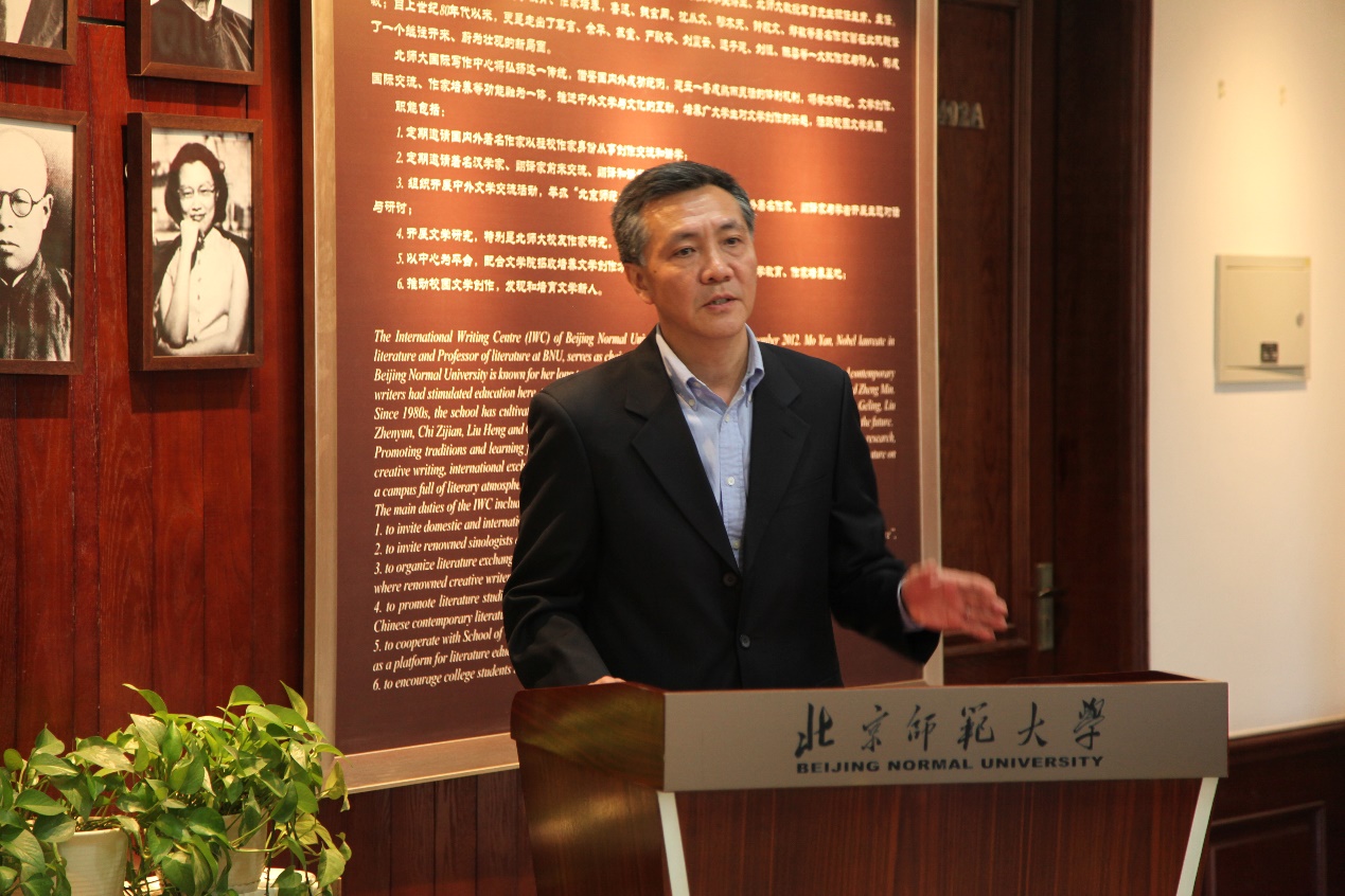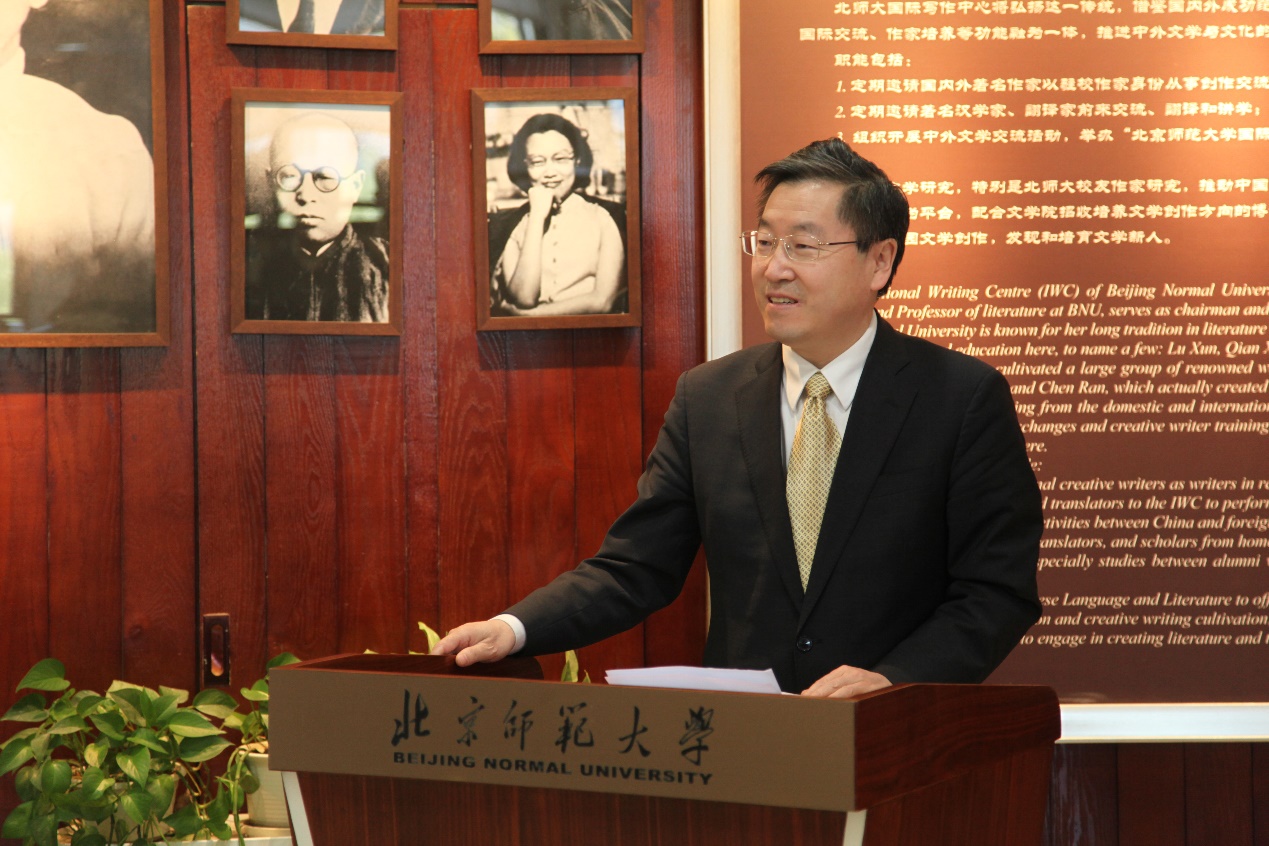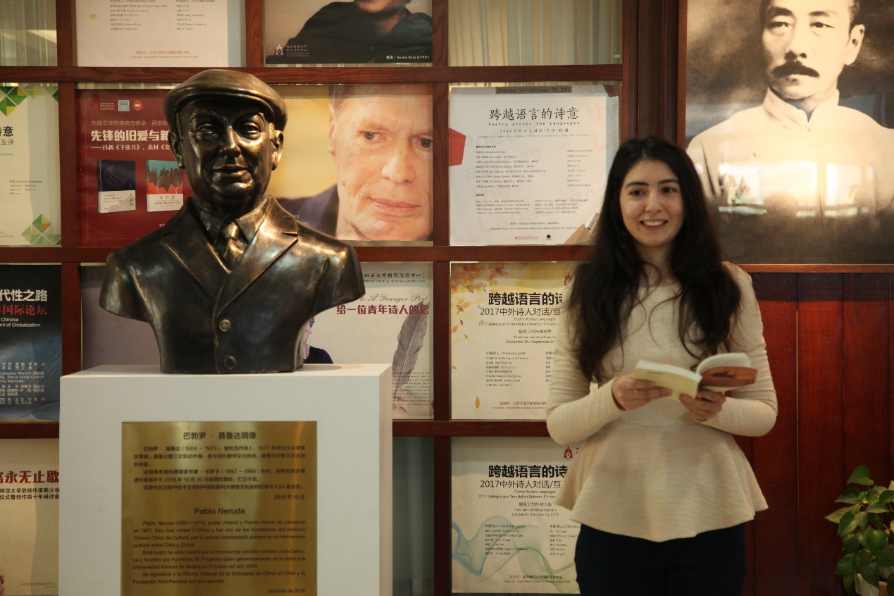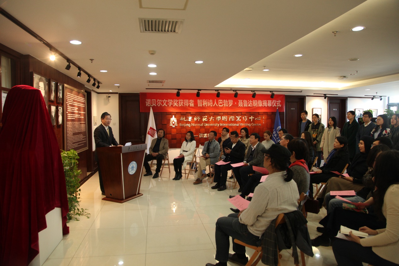 的兄弟情谊,以及当初对铜像摆放位置的决定,“无论铜像是坐落在艺术楼,还是写作中心,我们都感到非常愉悦和荣幸,因为它都是落在了中国,落在了在北师大。我们要学习聂鲁达的博大胸怀。”胡智锋院长还回忆了他在智利演讲时的趣事,智利人民对于艺术的热爱给他留下极为深刻的印象。胡智锋院长激情洋溢的讲述让现场气氛十分热烈。 最后,北师大特聘教授、著名诗人欧阳江河致辞。他将二十世纪的诗人分为两类,一类是走向知识与复杂观念的诗人,一类是大地般广阔的游吟诗人。他认为,聂鲁达是后者中最伟大的诗人,他直接超越了风格与历史,属于整个文明,并与自然、生命、阳光、花朵、风、永恒……息息相关。他说道,每次来到写作中心,都能看见北师大文学创作专业的学子在这里自习,那么从此以后,学生们的研习、阅读、讨论,将要经受几束目光的注视、祝福与提醒:不仅有莫言先生活生生的目光,有鲁迅先生照片里的目光,还有聂鲁达那由青铜浇筑的目光。今天,我们见证了这三束目光的交汇,将来,这些目光会永远感召我们,会融入到来者的生命之中,并成为北师大重要的风景。 随后,周作宇副校长向贺踊参赞夫妇、王薛彤主席赠送精美的纪念品。嘉宾们共同为巴勃罗·聂鲁达铜像揭开红幕,留下合影。 仪式的最后,当代文学博士生、北师大国际写作中心秘书贺嘉钰与当代文学留学生、来自阿根廷的Ema Indira Velazquez Burmester分别用中文、西班牙语朗诵了聂鲁达的诗篇。其中一首《中国大地之歌》,是聂鲁达访华期间与艾青交往后,两位诗人互赠的作品。聂鲁达是一位大地诗人,而中国也拥有广袤富饶的大地,他曾对中国的土地这样诉说:“我只是想用/自己的双手/抚摸你的绿色的胸膛/让你的黏土来塑造我/让你的风来创造我/我想成为/你的黏土和风的原始的儿子”。而艾青也在给聂鲁达的赠诗中深情写道:“我们来自许多国家/包括许多民族/有着不同的语言/但我们是最好的兄弟……我们的世界/好像很大/其实很小/明天,要是天晴/我想拿铜管的望远镜/向西方眺望/太平洋的那边/是我的家乡/我爱这个海峡/也爱我的家乡”——看来,从今以后,我们不再需要用望远镜去“眺望”聂鲁达了。